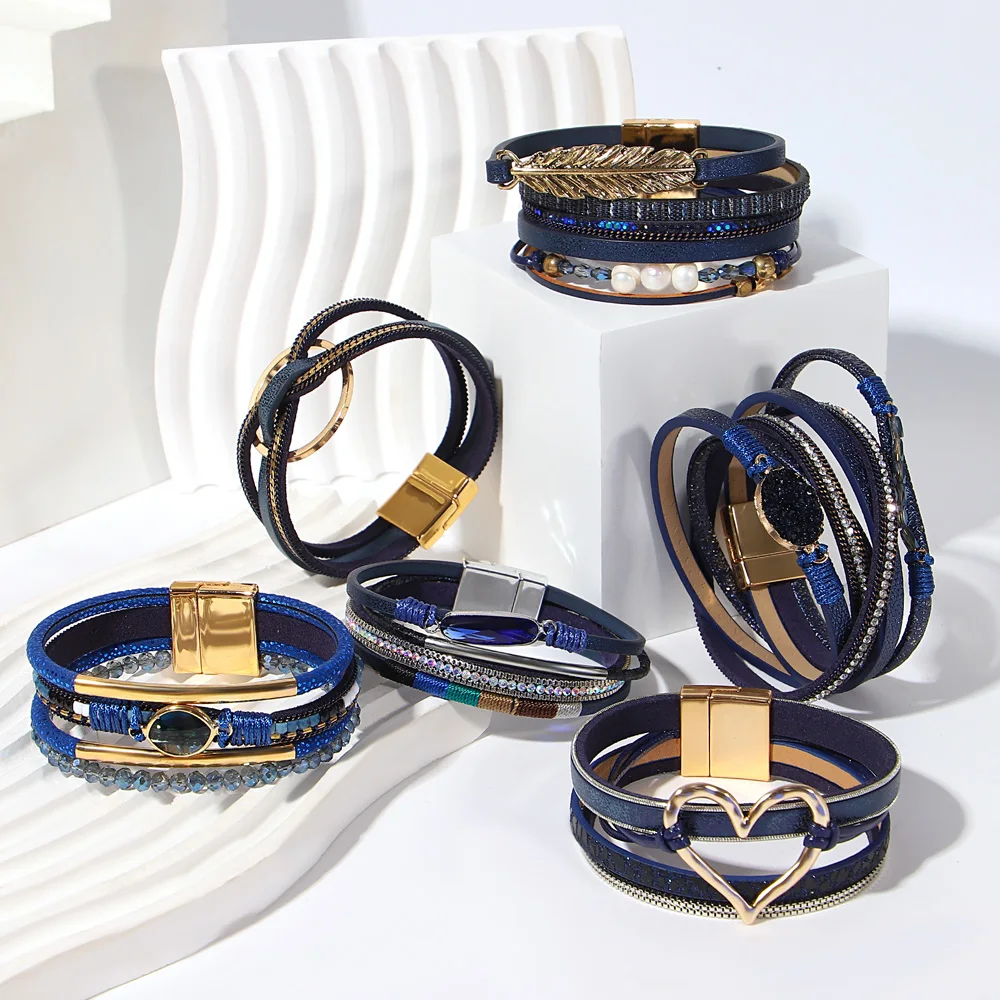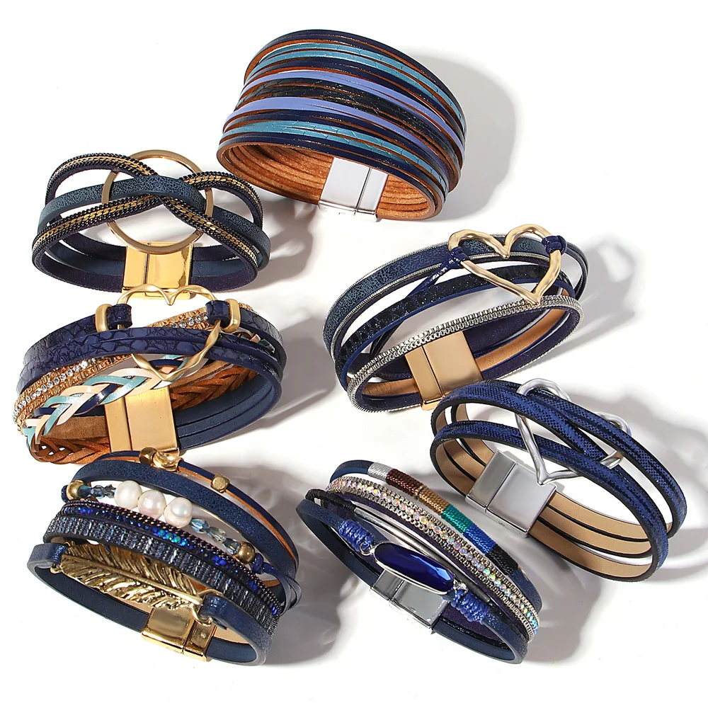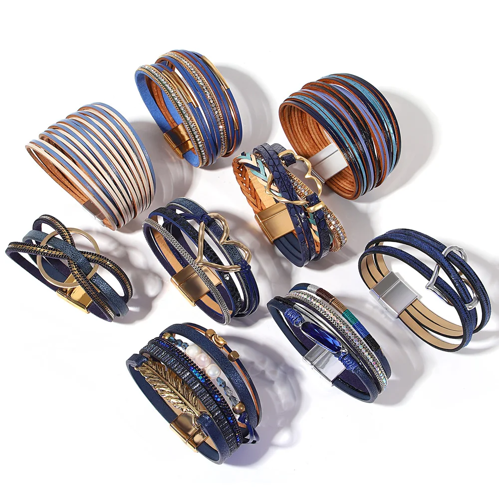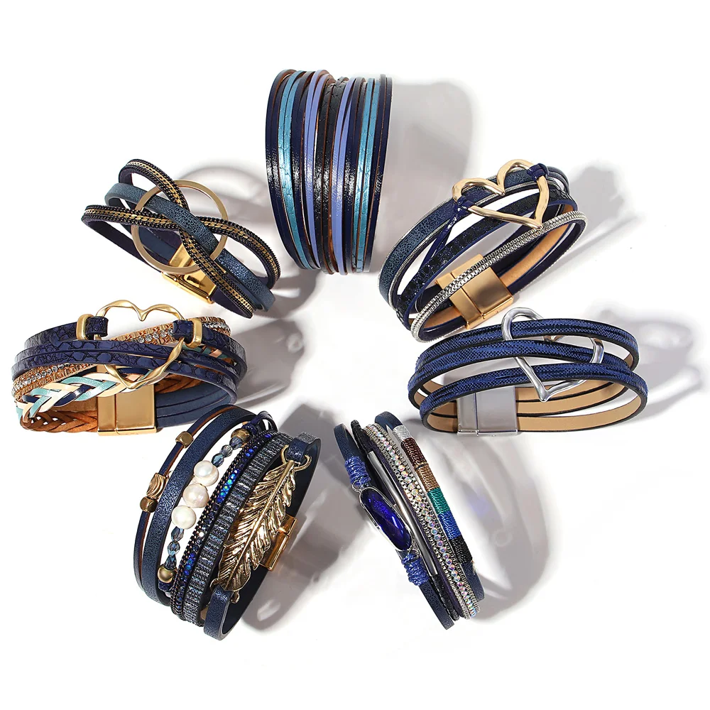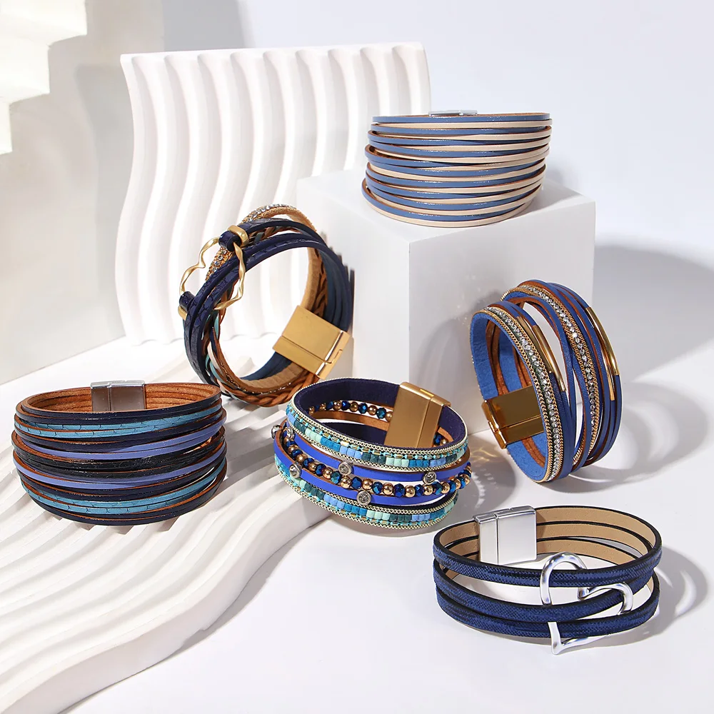 Fashion Braclet: Boho Multilayer Wrap Blue Leather Bracelets