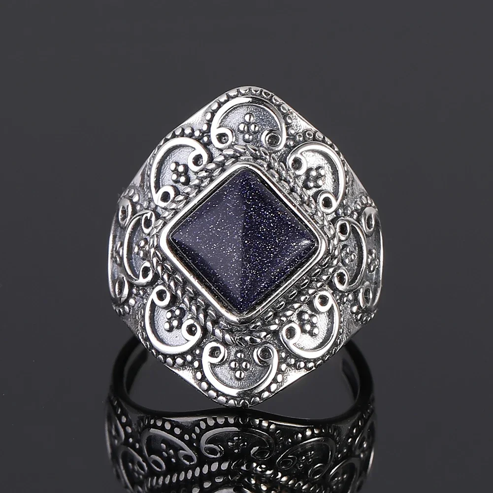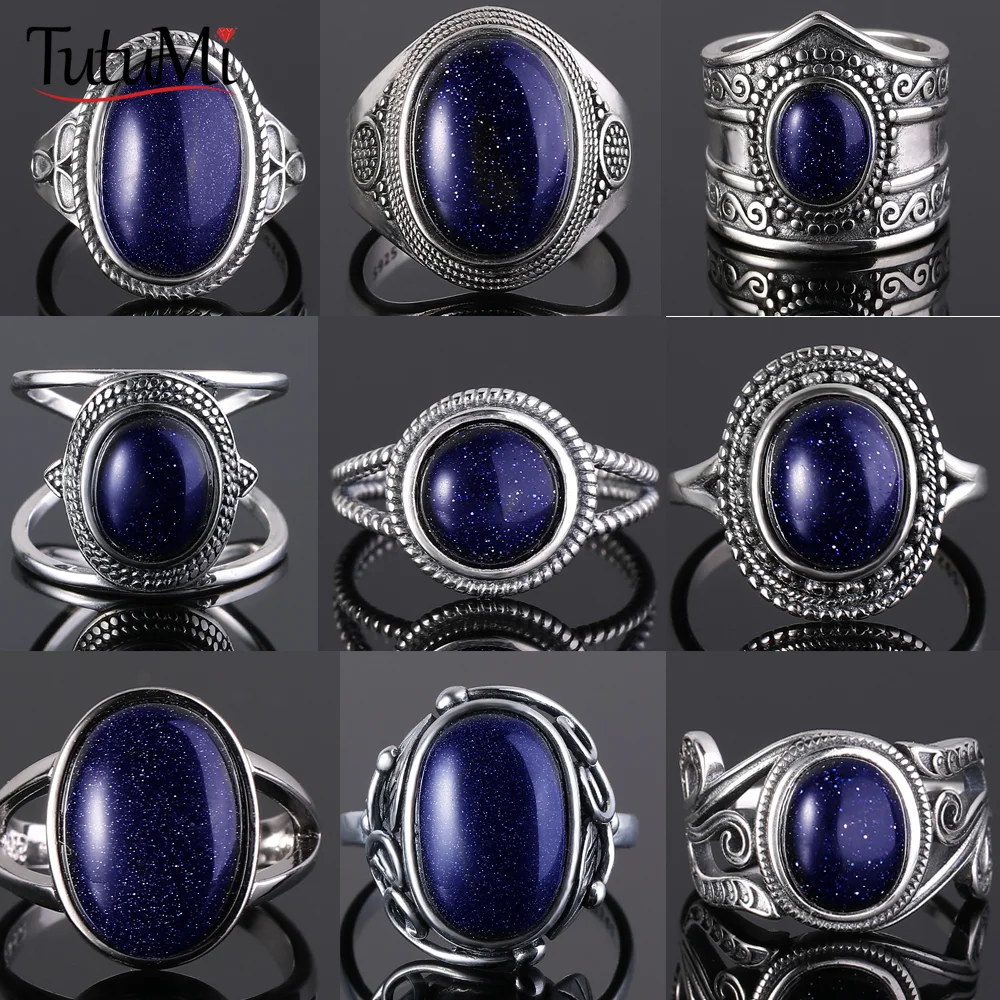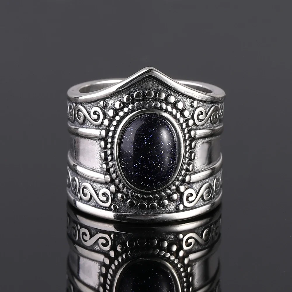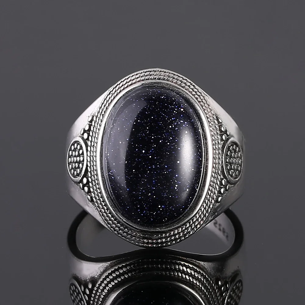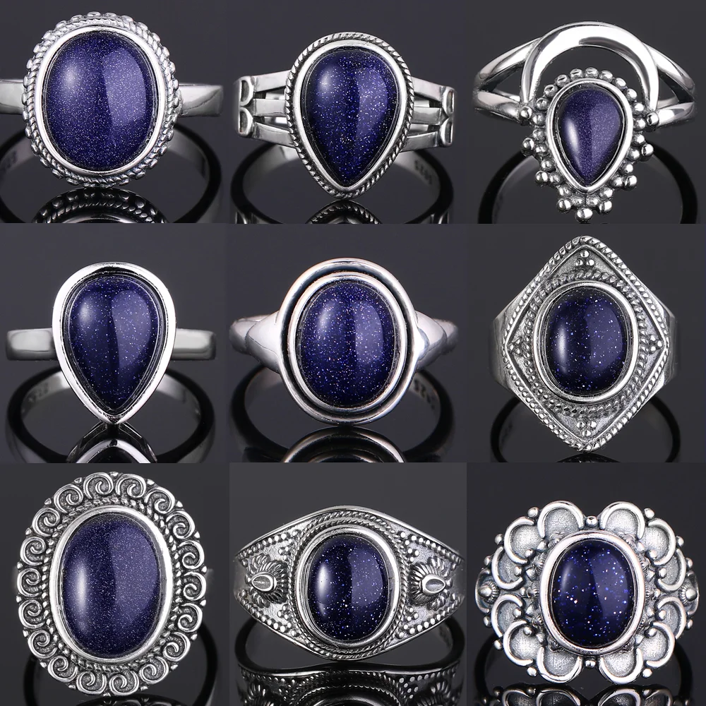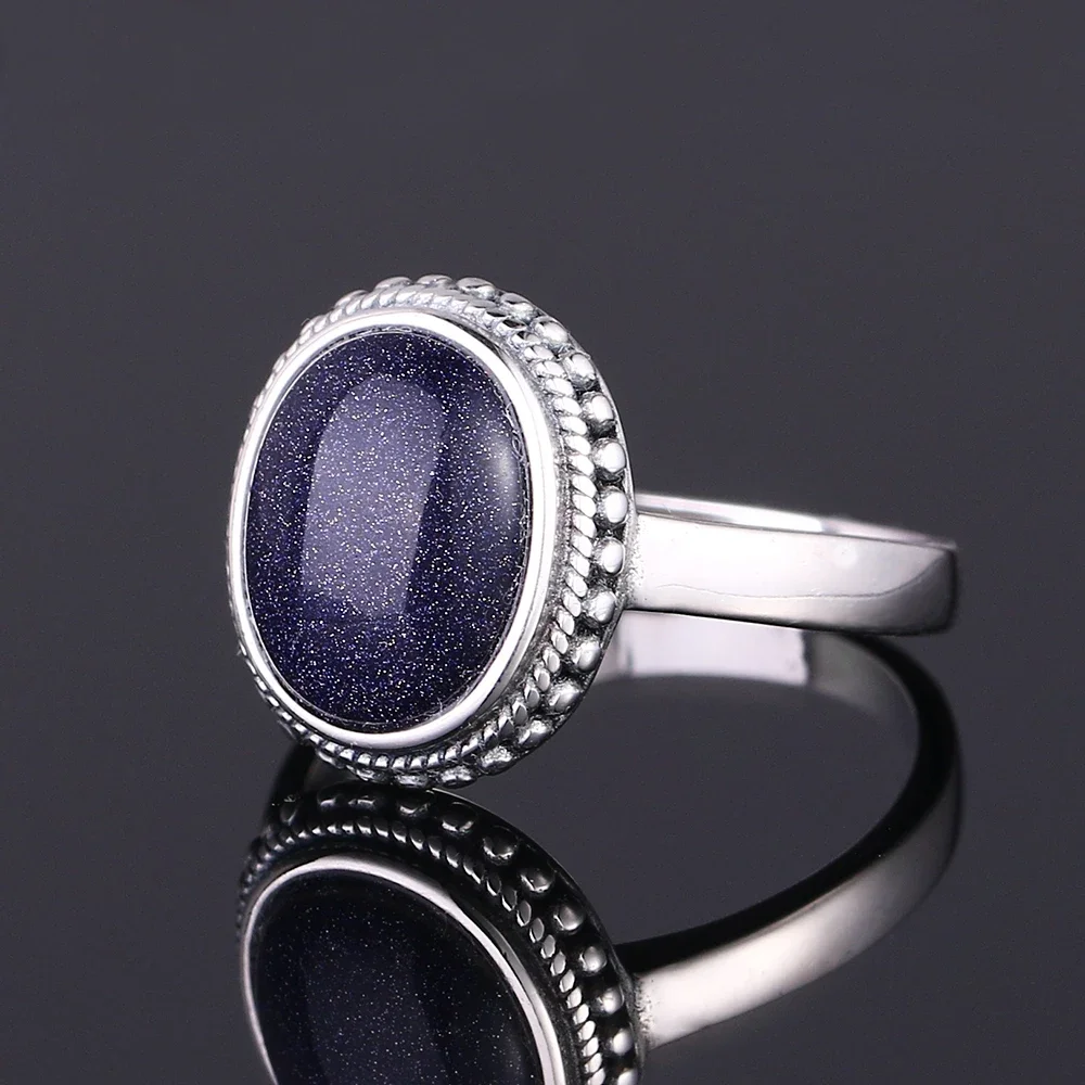 Ring aus 925er-Sterlingsilber, oval, rund, natürlicher blauer Sandstein, Ring für Frauen, Geschenk, Retro-Luxus, edler Schmuck