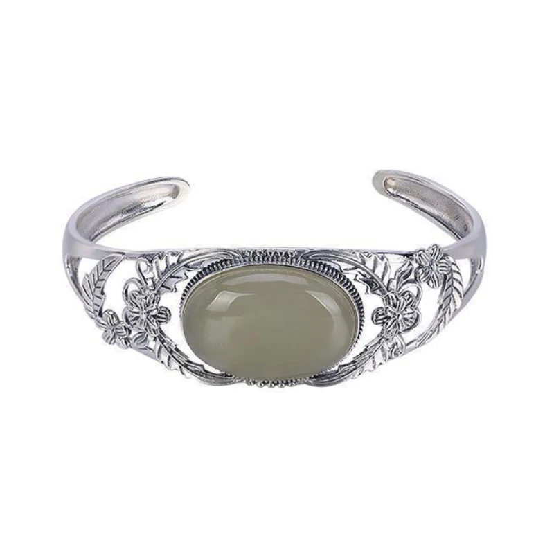 Vintage Silber eingelegte natürliche Hetian Jade Blume Hohl Armreifen für Frauen eleganten Ethno-Stil Hochzeit Verlobung Schmuck