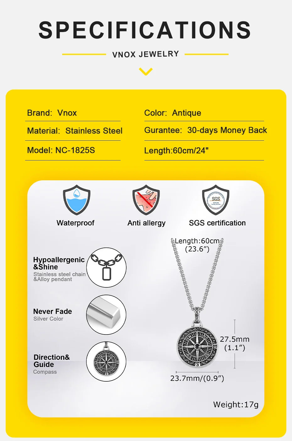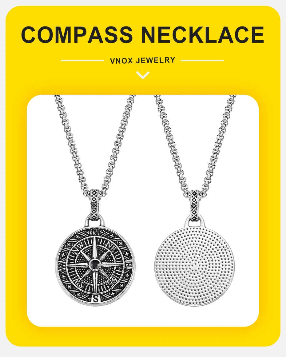 Vnox Vintage-Kompass-Anhänger-Halsketten für Männer und Jungen, Münz-Halskette aus Edelstahl, Rock-Hiphop-Kragen, Abschluss-Gid-Geschenk